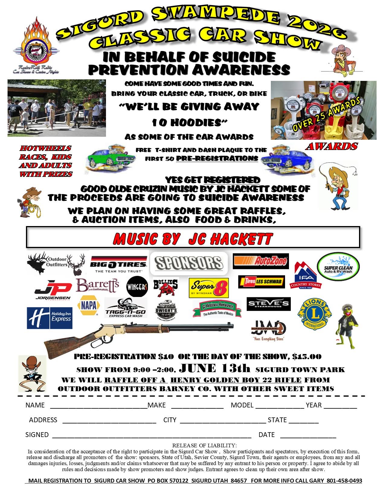 Car show in behalf of suicide prevention awareness. Free t-shirt and dash plaque to the first 50 pre-registrations. Music by JC Hackett.