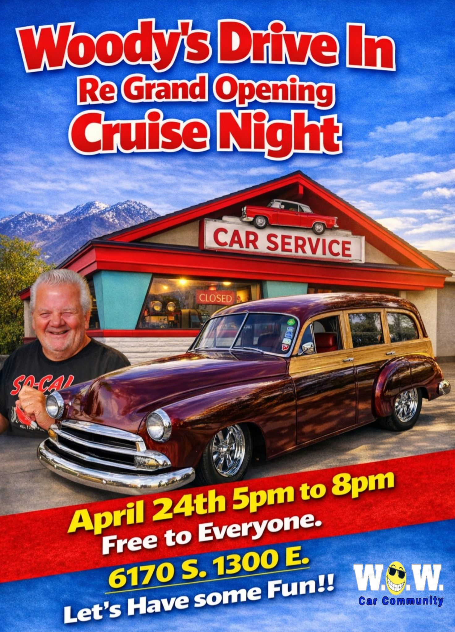 Limited parking, get there early to get a spot! Try Woody’s great menu, tunes by W.O.W., prizes, awards, and fun!